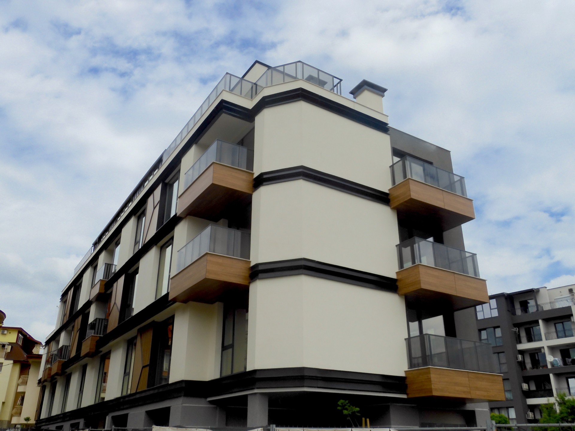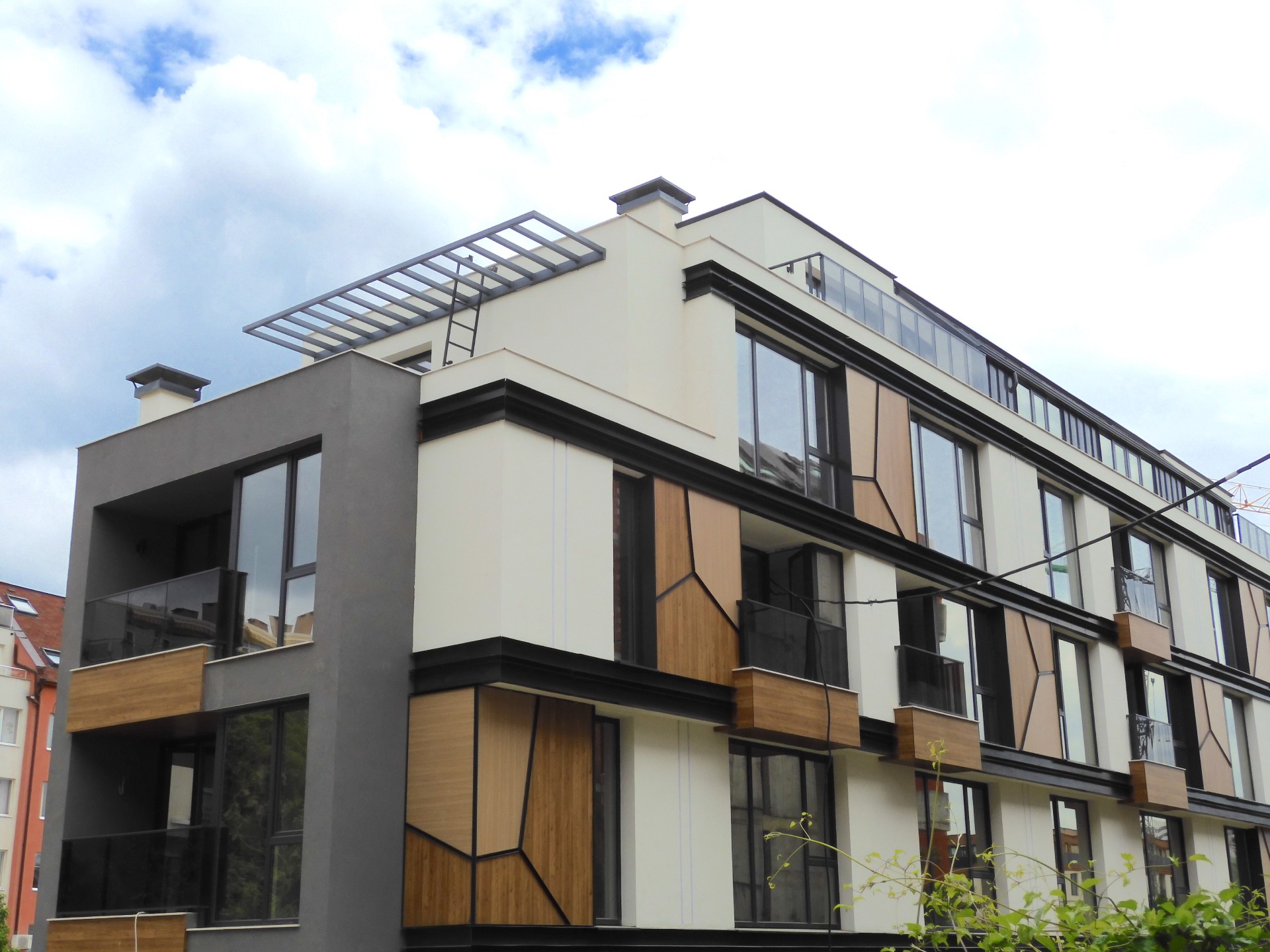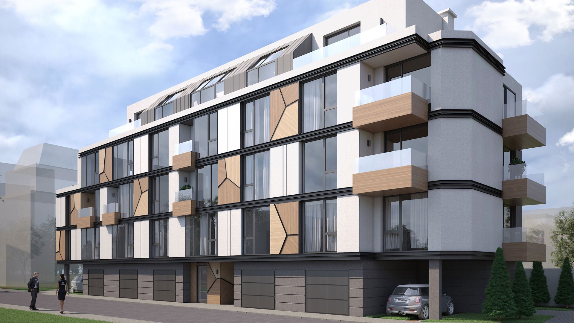 Сградата е със стилна архитектурна визия, съчетаваща фасада от силикатна мазилка, окачена фасада с HPL плоскости, френски прозорци - петкамерна дограма с троен стъклопакет и парапети от многопластово закалено стъкло. Апартаментите са само 13 и са разположени на разгъната застроена площ от 1236м2. Разпределенията могат да бъдат променени според желанието на клиента и допустимите конструктивни характеристики.