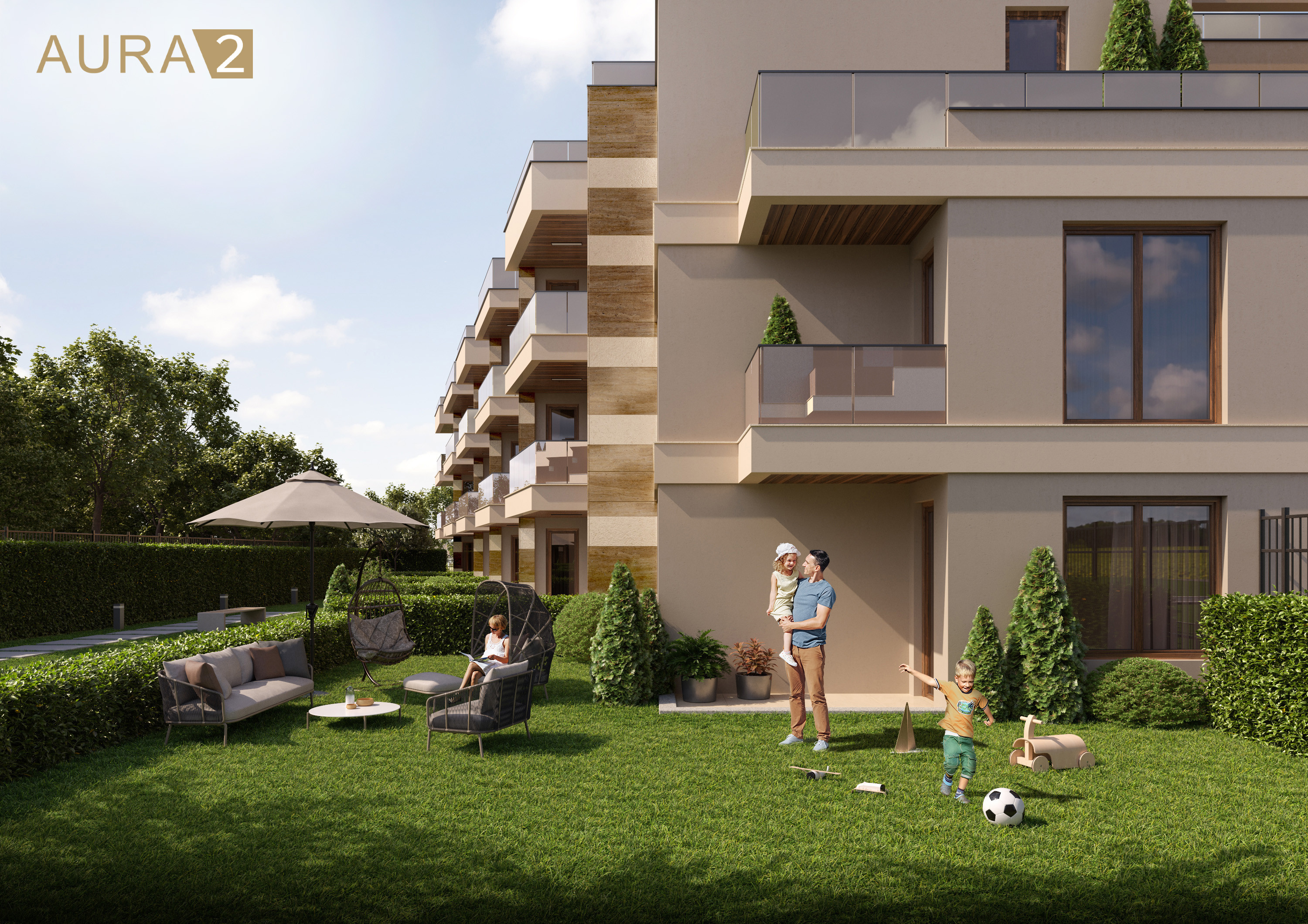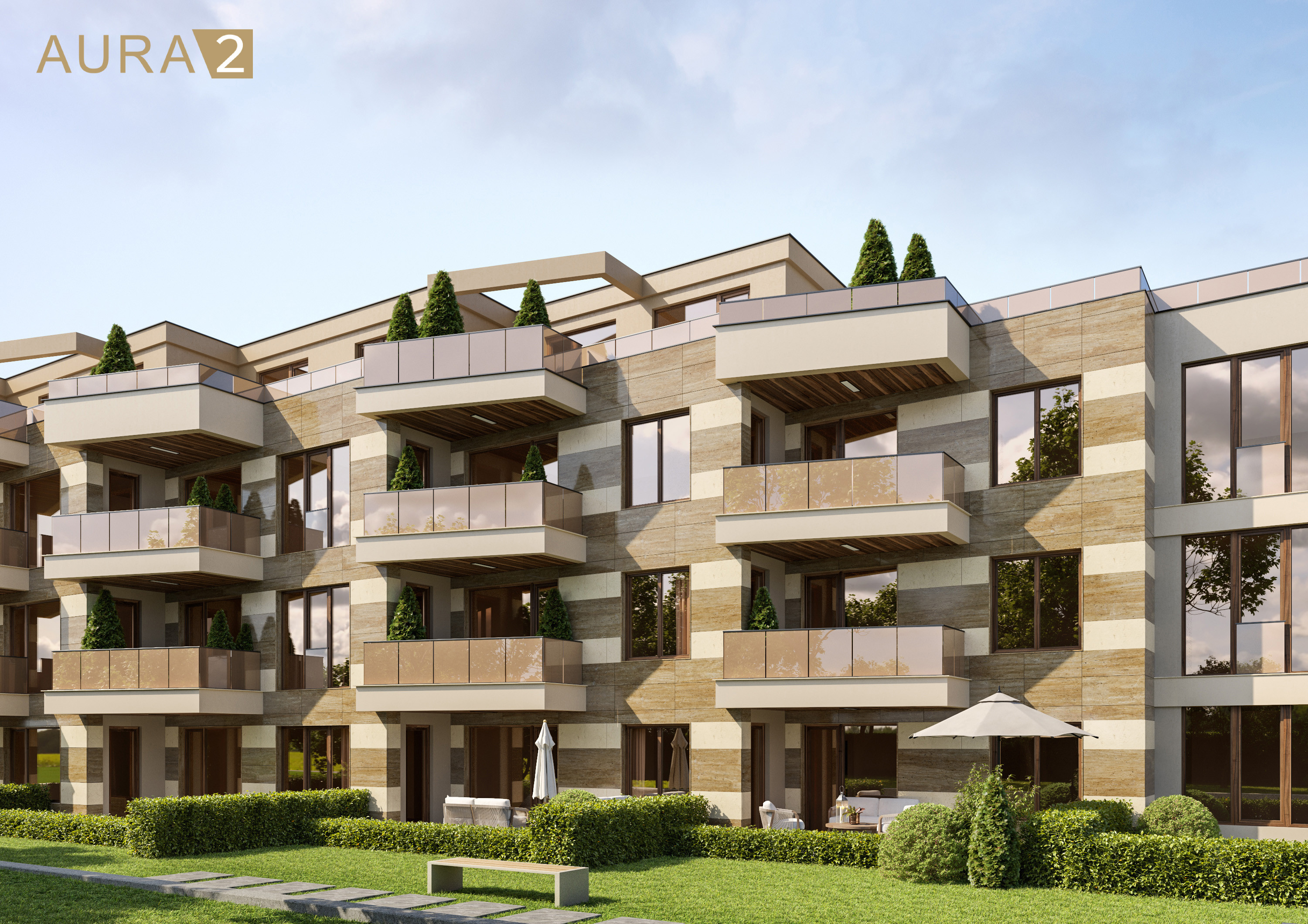 Сграда AURA 2 разполага с 25 апартамента с една, две или три спални и най-вече просторни всекидневни започващи от 30 кв.м. и спални помещения от 15 до 20 кв.м.