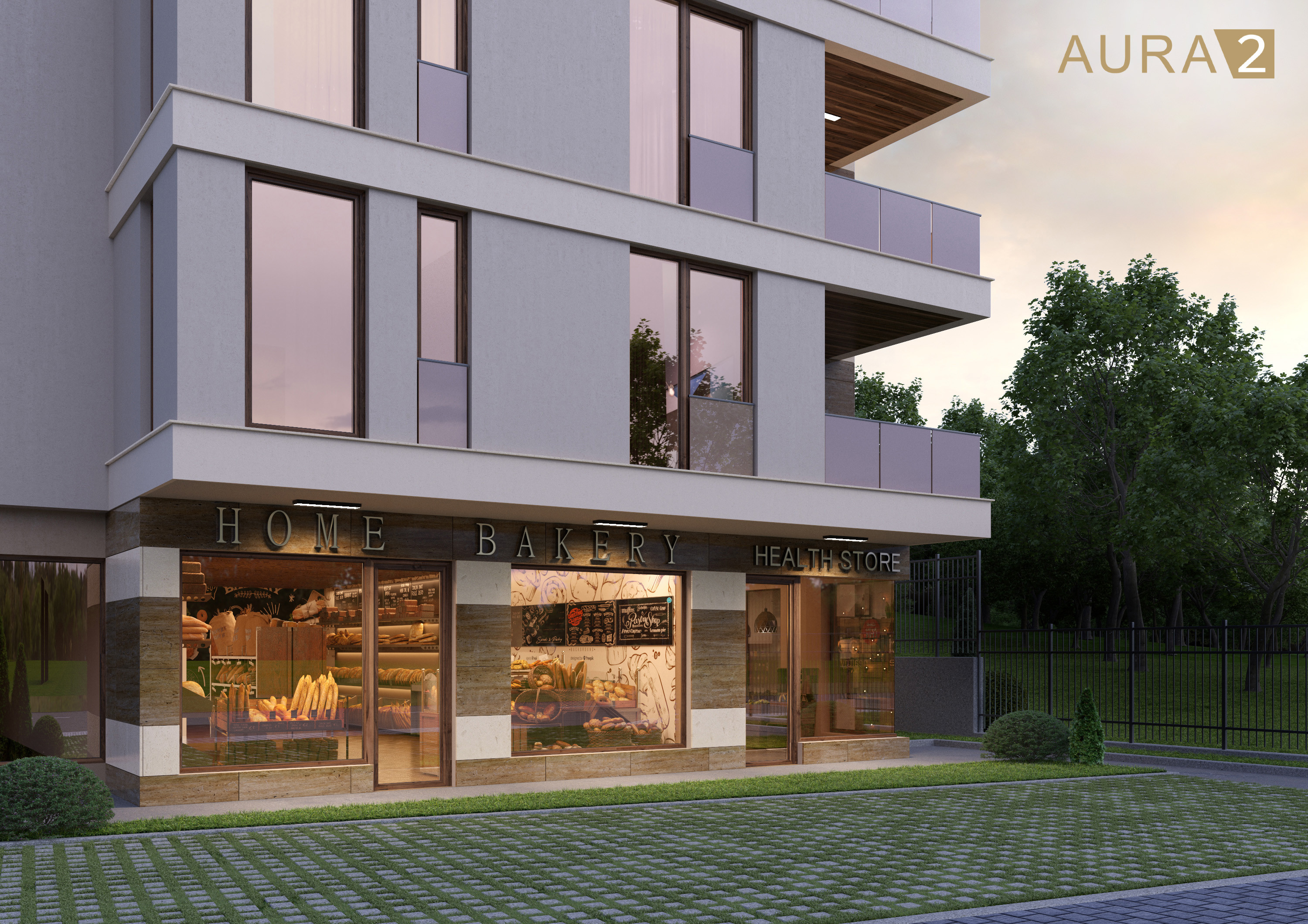 AURA2 разполага с търговски обекти на партерно ниво със статут на магазини и са подходящи за офис, yoga studio, co-working space, козметичен салон. Предвидена е реценция с портиер и зона с мека мебел, санитарно помещение на ниво партер, склад за общите нужди на блока. Разполагат с високи стъклени витрина 3.20 м. и озеленени общи части.