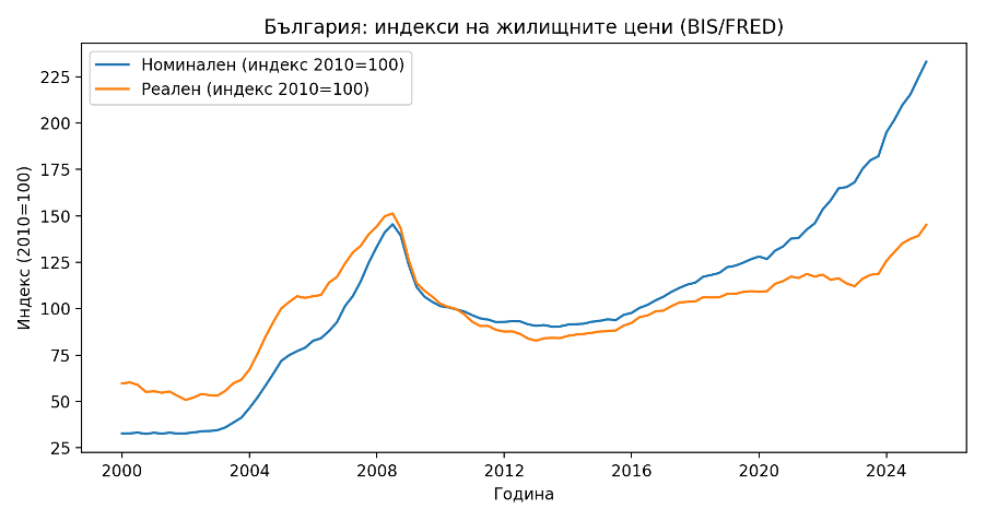 Ключов извод: Цените са циклични, но дългосрочното ниво се измества нагоре (2000->2025: ~7.1 пъти номинално; ~2.4 пъти реално). Данни (НСИ): Q2 2025 +15.5% на годишна база; София +4.9% спрямо третото тримесечие на 2025 г.